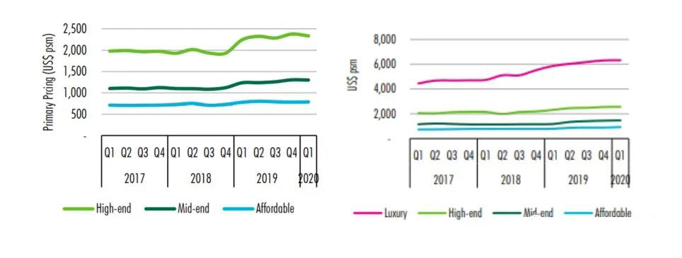 2020年第一季度数据显示,目前河内房均价在1375美金/㎡,而胡志明在1936美金/㎡,其中,河内高端项目的房价在3500美金/㎡,但是胡志明市已经达到了6000-7000美金/㎡,主要还是受市场供需矛盾影响。